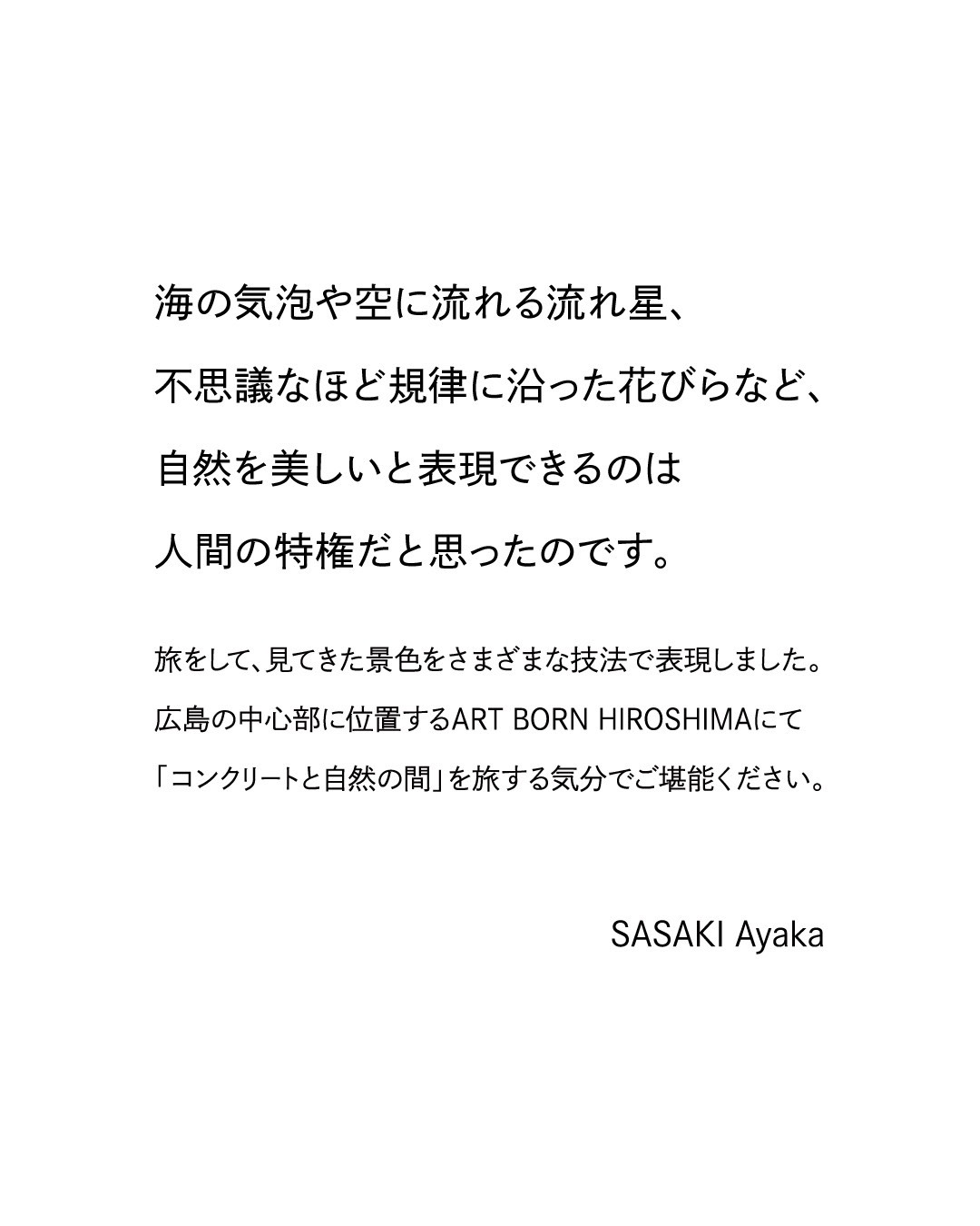 旅をして見た海の気泡や空に流れる流れ星、不思議なほど規律に沿った花びらなど、美しいと感じた自然を感じたままアートに表現しました。
