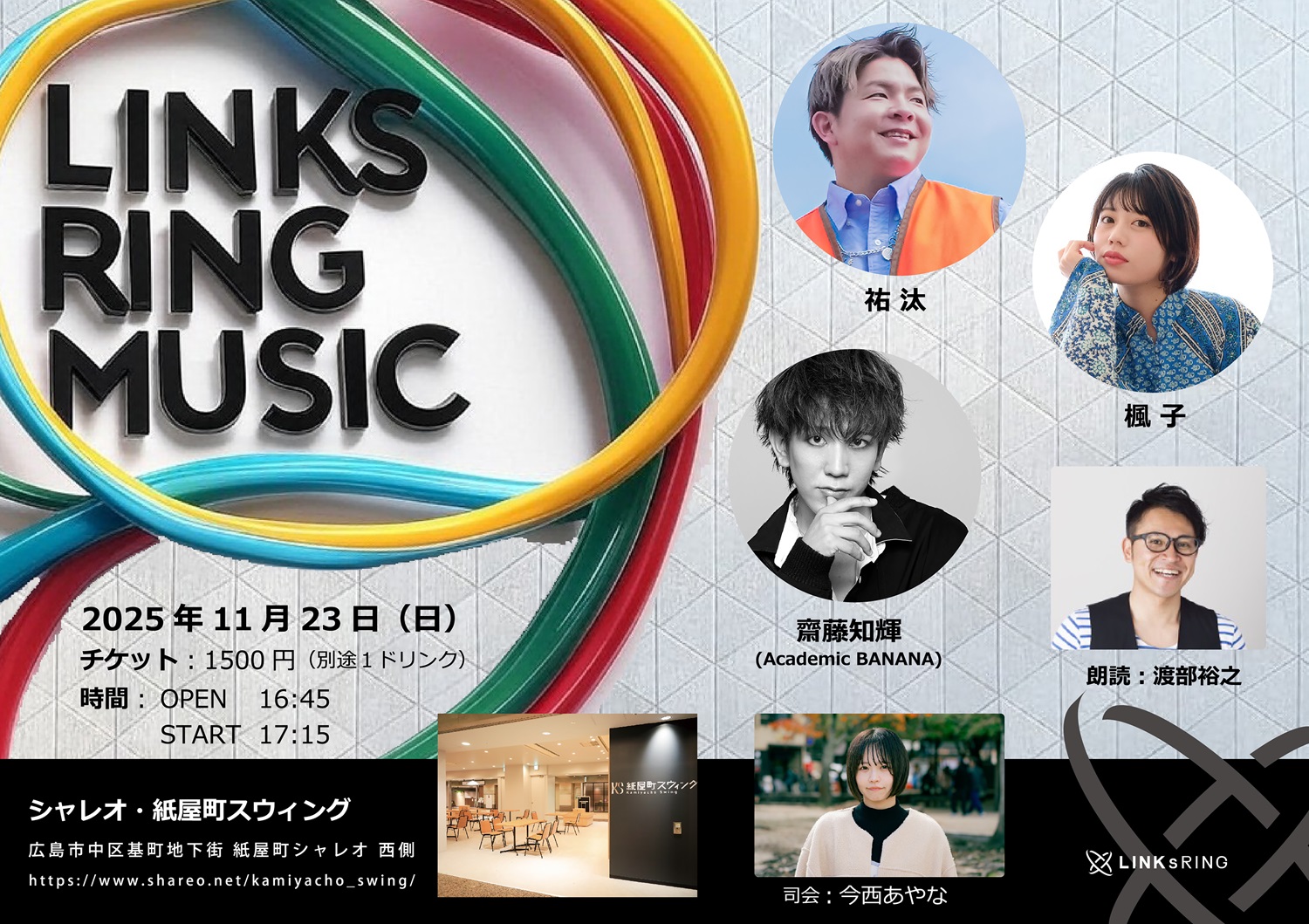 2025年11月23日(日)■LINKsRINGミュージックライブ(episode5)場所:シャレオ・紙屋町スウィング時間:開場16時45分 開演17時15分チケット:1500円(別途1ドリンク)出演:楓子,祐汰,齋藤和輝(Academic BANANA),渡辺裕之,今西あやな※司会:今西あやな