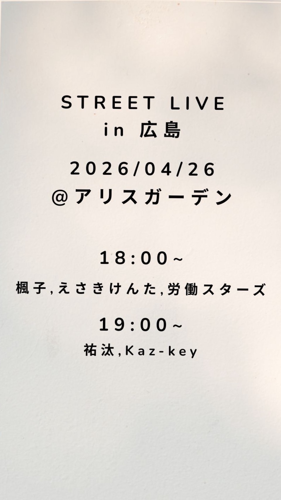 2026年4月26日(日)アリスガーデンで路上ライブに参加することになりました!18:00-労働スターズ・楓子・えさきけんた19:00-祐汰・Kaz-key