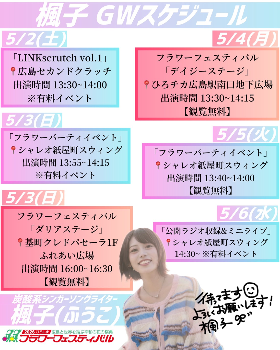 2026年5月3日(日)■ダリアステージ場所:基町クレドパセーラ1F楓子出演時間:16:00〜16:30